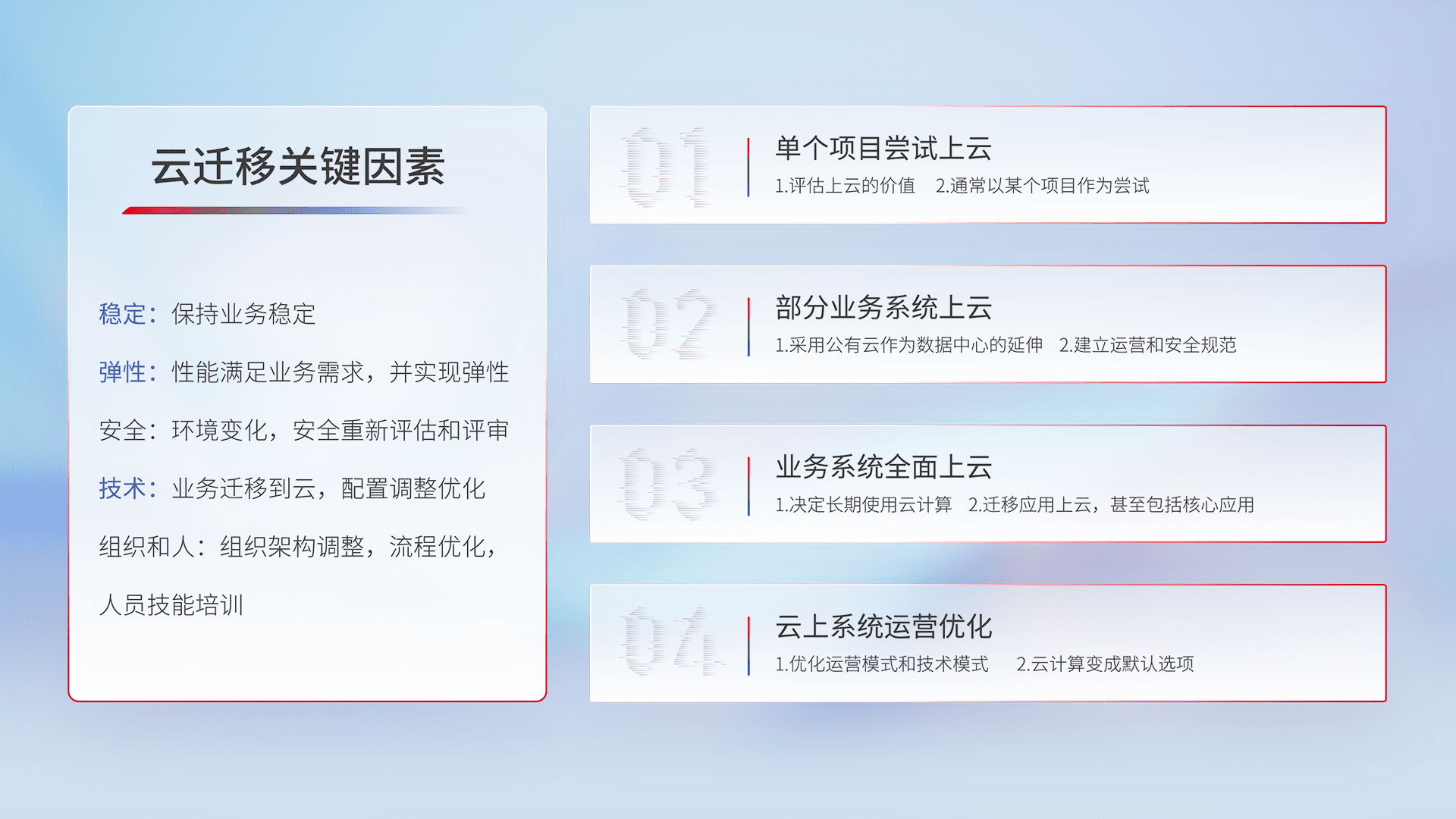 结合实际业务,,从规划设计、、、云平台选型、、云原生改造、、、、数据迁移、、、、集成交付,,,,迁移全过程为客户识别最佳上云路径,,,,做好风险识别管理,,,设计网络架构、、身份权限、、安全审计合规、、、操作审计、、、、日志审计、、监控告警策略、、多站点容灾设计等,,对云上基础设施进行整体规划,,,提升IT治理水平,,,,以满足弹性、、、高可用、、、、高性能的需求。。