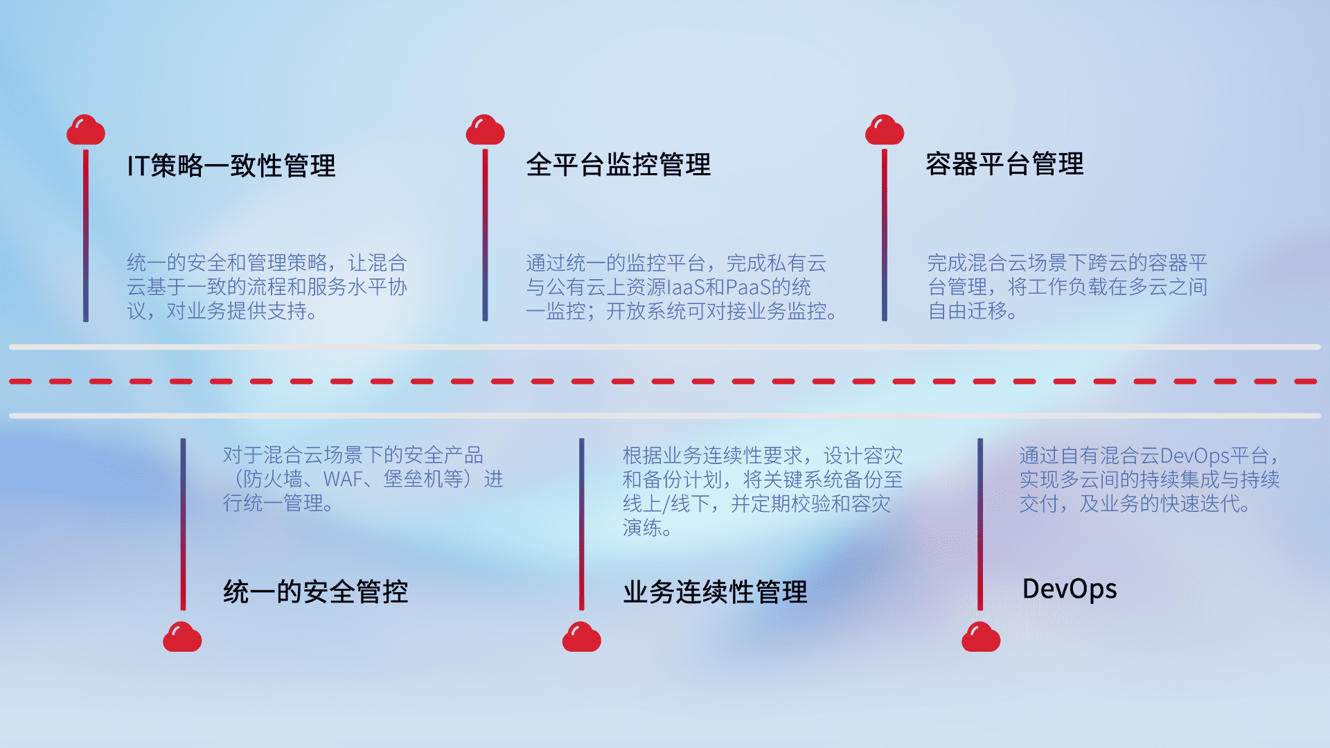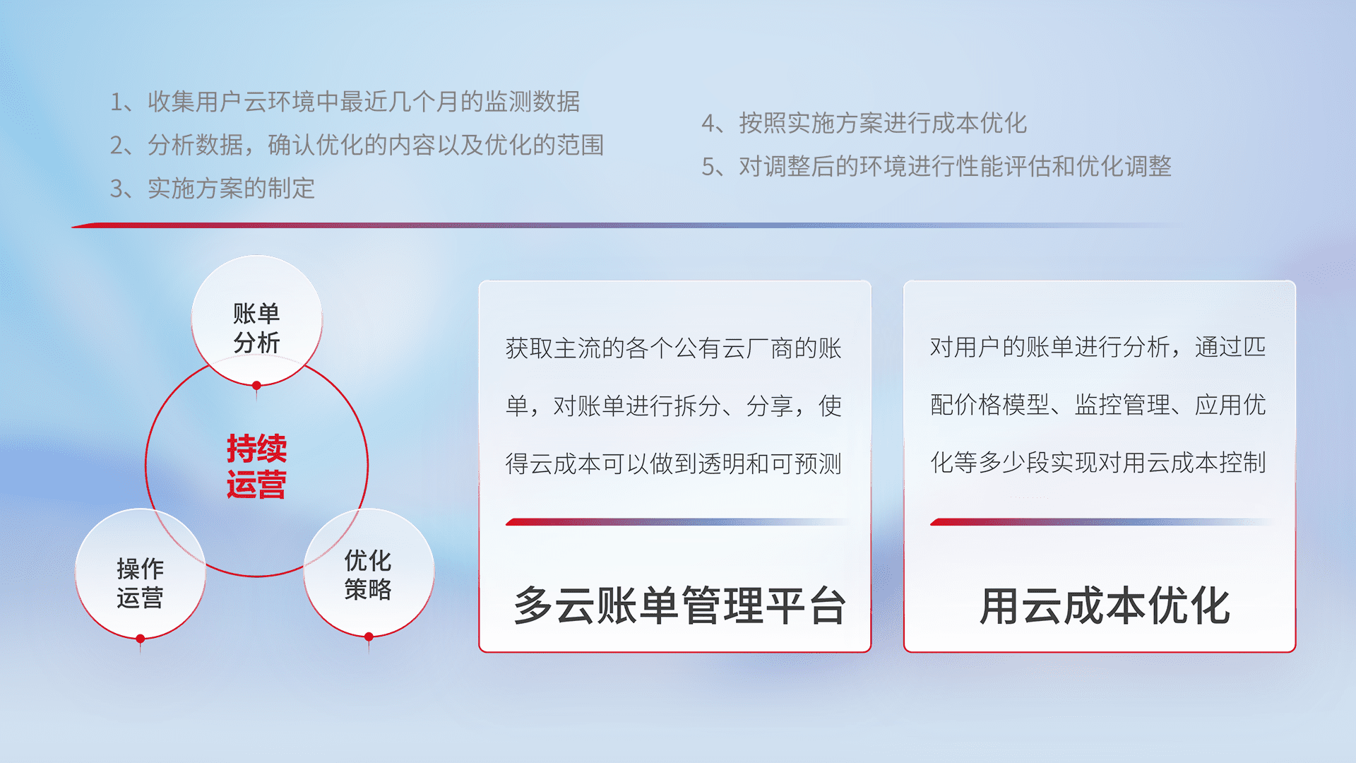 通过多云纳管,,,,以统一的资源数据模型把客户的云资源进行抽象和封装,,,进而实现对多云资源的统一操作,,保障云资源管理的可靠性、、、、稳定性与可用性。。量身定制化运维内容,,配置、、、开发运维、、、、补丁管理、、备份、、、、监控、、、认证和访问管理、、审计和日常巡检等,,,,保障在用云过程中的可靠度,,,,稳定度以及高可用率。。